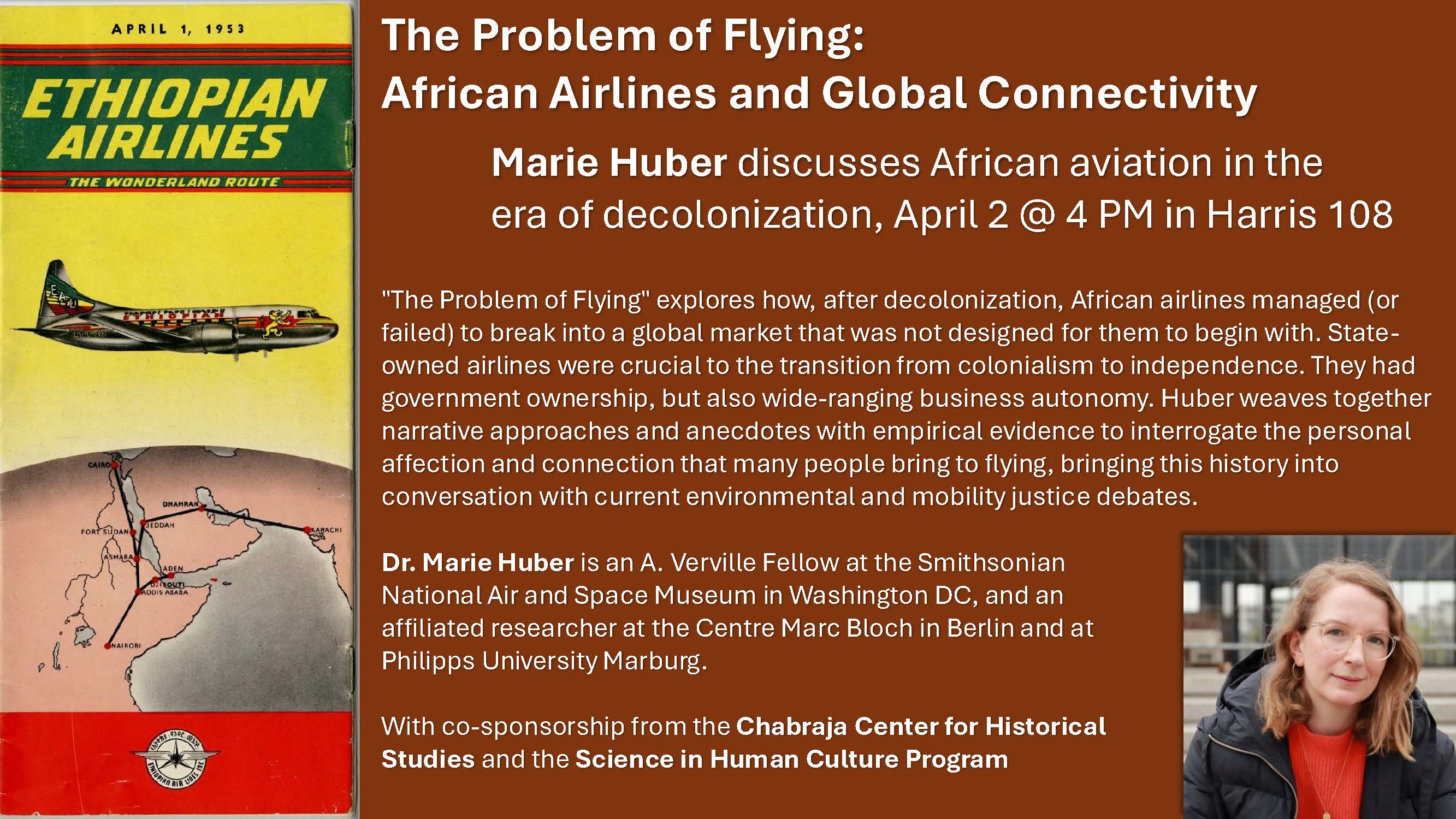 The ability to move around the world by plane is one we take for granted today. Yet, most of the world's population has never set foot on a plane. The tension between opportunity and constraint sits at the very core of the history of civil aviation: opening up the world for some, but barring or downgrading many from full connection. The book project The Problem of Flying takes on the history of mass air travel from one of its margins and explores how, after decolonization, African airlines managed (or failed) to break into a global market that was not designed for them to begin with. The book shows how state-owned airlines served as a linchpin for the transition from colonialism to independence and represents a more varied perspective on the history of these transitions and the ideas that drove them - and how they were shaped by technologies and global energy resources. The airlines had government ownership, but also wide-ranging business autonomy to stay operative in a global, competitive market. The book interrogates the personal affection and connection that many people bring to flying, and help connecting it to current environmental and mobility justice debates.